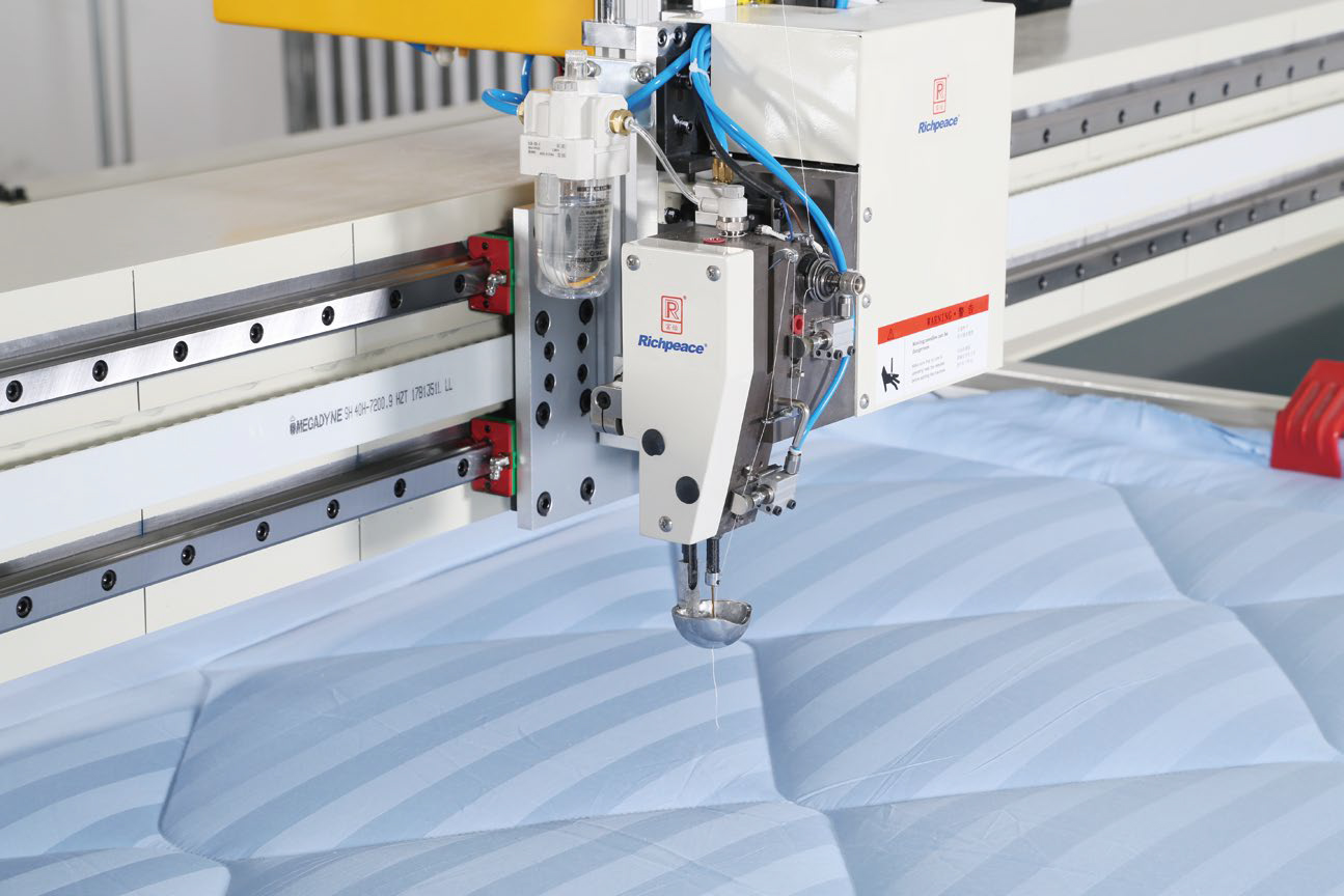 5、自動升降機頭,絎完一床物料后,機頭自動升起,方便更換新料框;專門定制的縫紉機頭,獨立壓腳驅(qū)動,適合各種薄厚不同材料的絎縫。